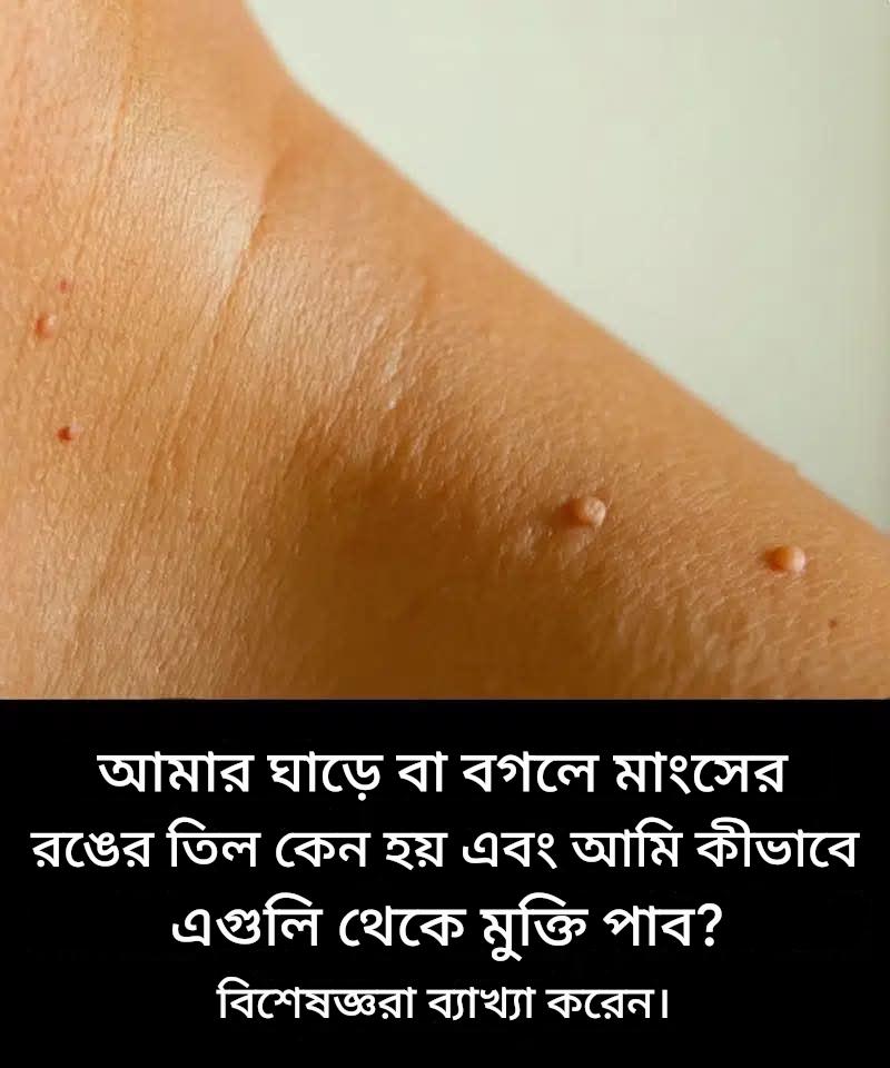 বেশিরভাগ সময়, ঘাড়ে বা বগলে যাকে “মাংসের রঙের তিল” বলে ডাকা হয় তা আসলে ত্বকের ট্যাগ। এগুলি আলগা কোলাজেন এবং রক্তনালী দিয়ে তৈরি ছোট, নরম, ক্যান্সারবিহীন বৃদ্ধি। এগুলি মসৃণ বা সামান্য কুঁচকানো বাম্প হিসাবে দেখা যেতে পারে এবং আকারে কয়েক মিলিমিটার থেকে কয়েক সেন্টিমিটার পর্যন্ত হতে পারে।