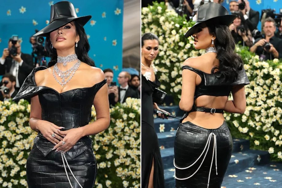 Kardashian wore a crocodile leather off-the-shoulder two-piece set by Chrome Hearts with an open back and long train. She accessorized the look with strings of pearls hanging by her waistband, a multi-strand diamond necklace and a large leather hat.
