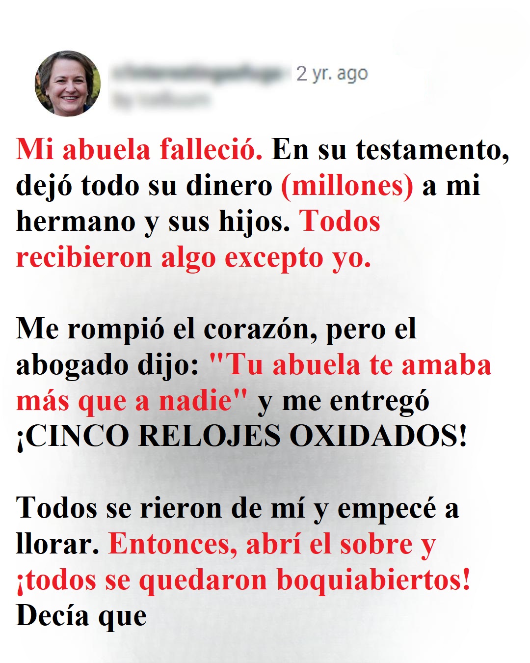 Un hermano codicioso hereda una casa y se burla de su hermana menor, quien solo recibe cinco viejos relojes oxidados de su difunta abuela. Poco sabían acerca de lo que se escondía en esos relojes. “¡Oh, así que la abuela también te llamó! ¡Pensé que estarías ocupado en la biblioteca… como un buen ratón de biblioteca!” Brian, de 26 años, se burló de su hermana menor Linda, de 19. Ella acababa de bajar del taxi. El miedo llenó sus ojos mientras su corazón le decía: “No le pasará nada a la abuela. Ella estará bien. Vivirá cien años más”.