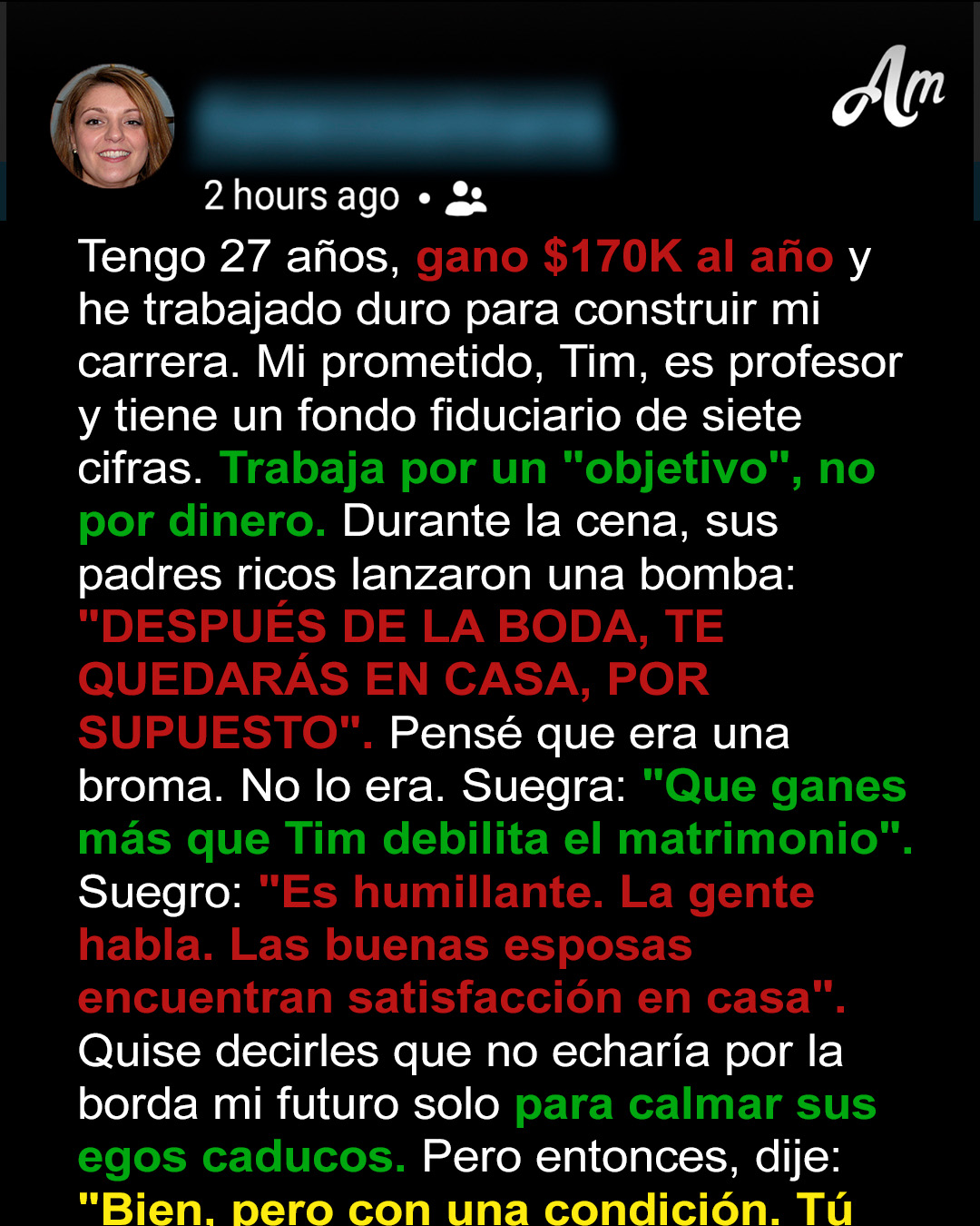 Los adinerados padres de mi prometido querían una nuera perfecta que se queda en casa, cocina y limpia. Creían que el hecho de que yo ganara más que su hijo de oro perjudicaba su hombría. Así que me pidieron que dejara mi trabajo después de casarme. Acepté, pero con una condición que les dejó boquiabiertos.