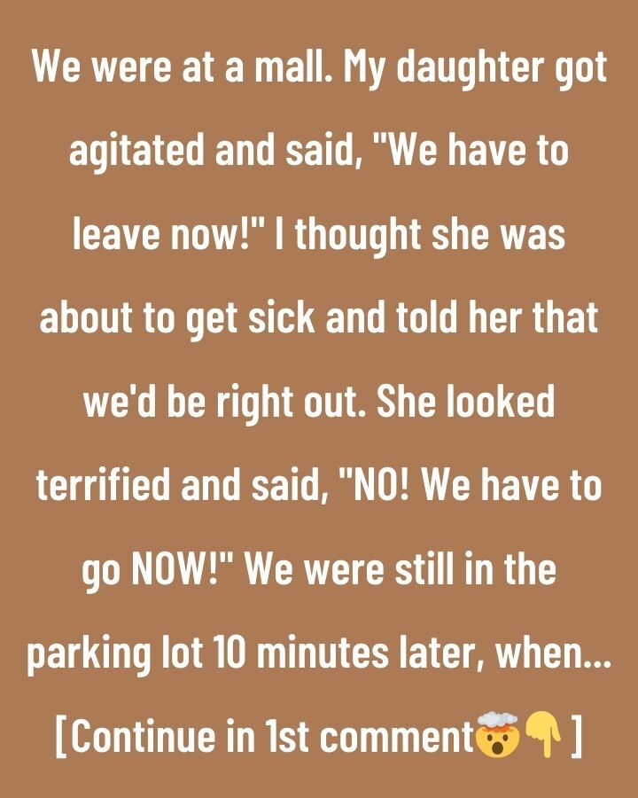 We were at the mall, just finishing up some shopping, when my daughter suddenly froze. Her face went pale, and she grabbed my hand. “We have to leave. Now,” she said, panic rising in her voice. I thought she might be feeling sick, so I reassured her we’d head out soon.